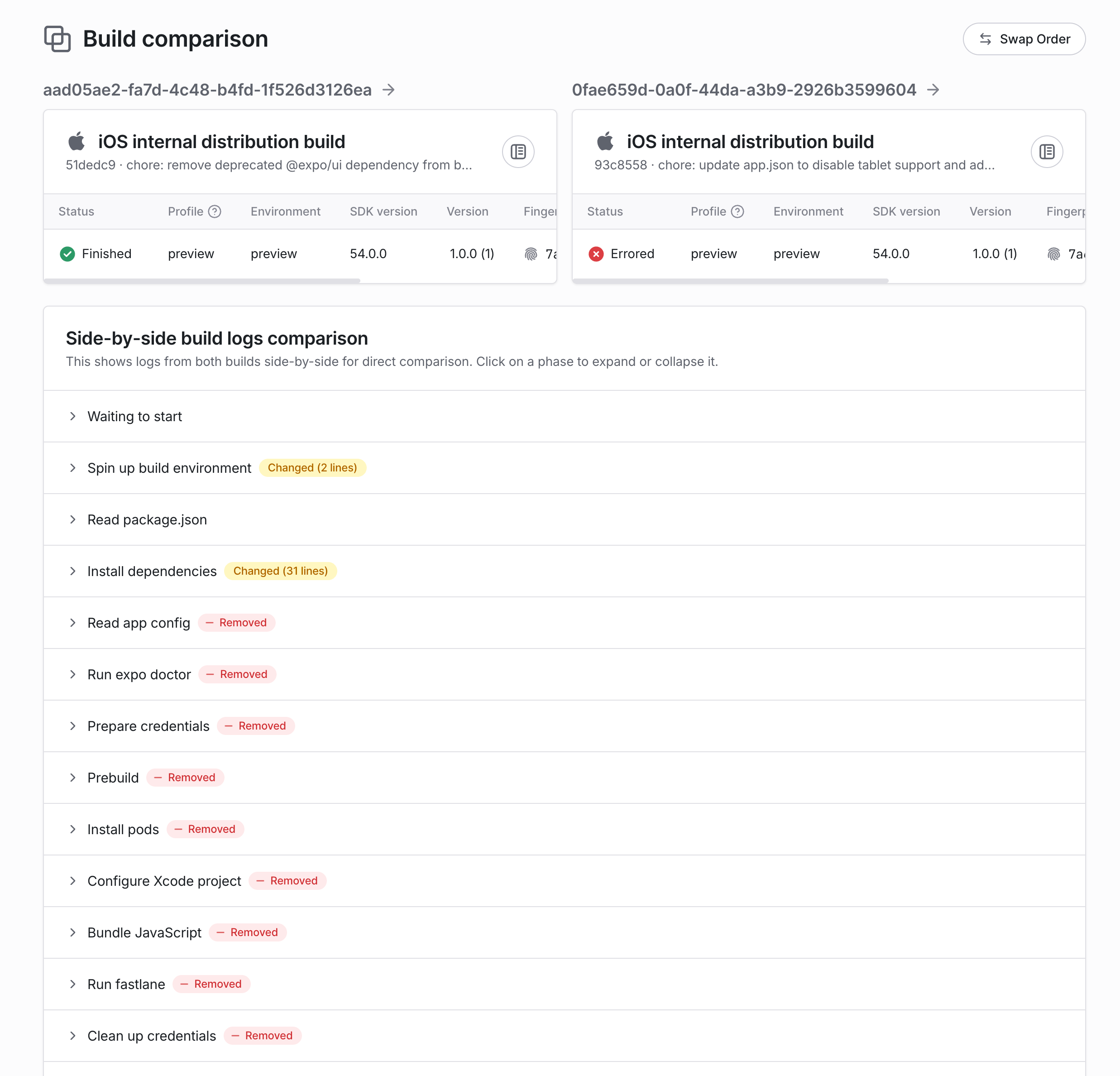 当之前成功的 EAS Build 开始失败时,找出两次构建之间发生了哪些变化,有助于定位根本原因。EAS Build 详情页面上的 Compare 按钮可以帮助你并排比较两个构建,显示它们在构建日志和配置上的差异。