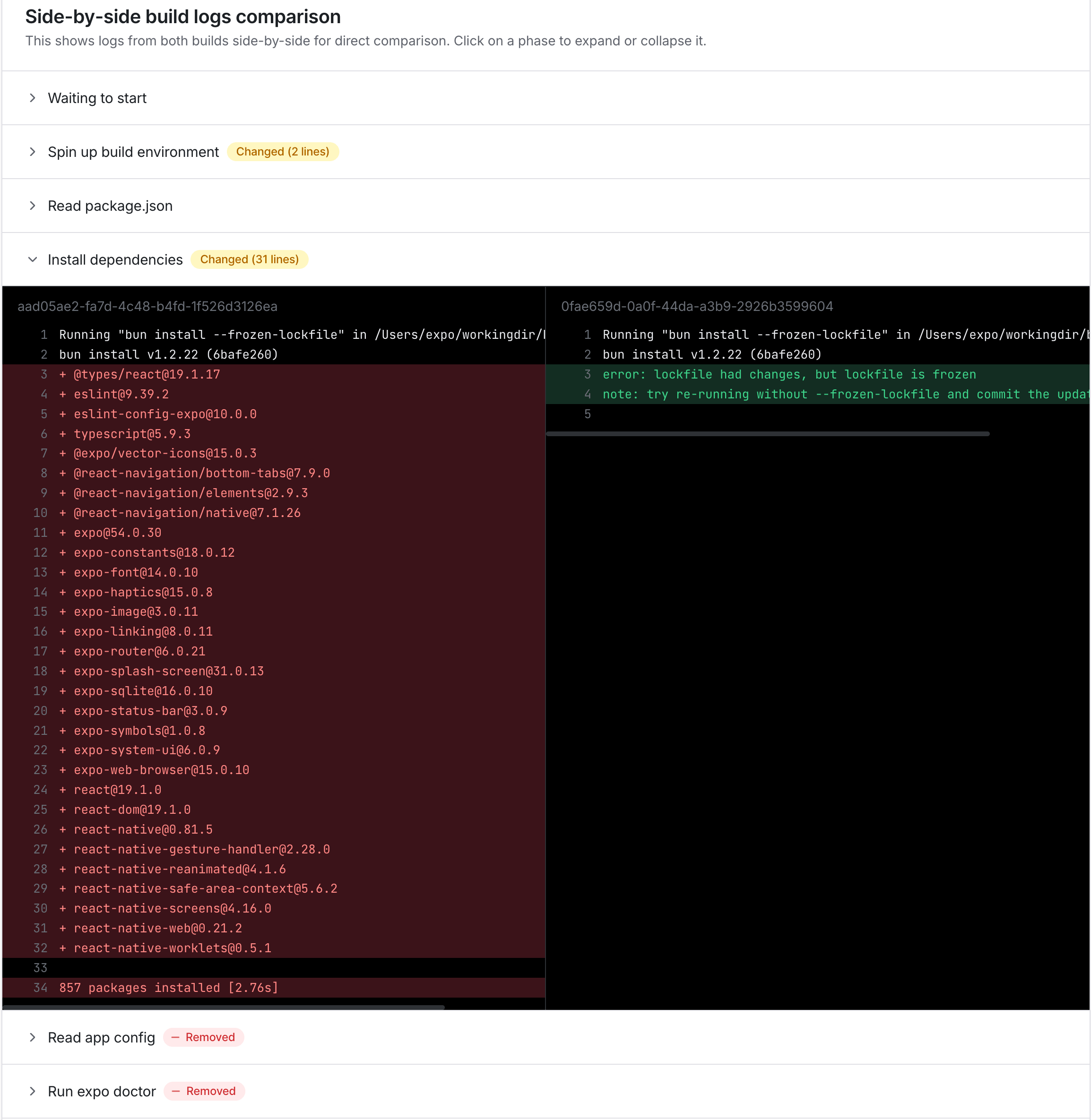 在上面的示例中,将右侧失败的构建与左侧成功的构建进行比较,可以看出已安装包的差异,并突出显示了 lock 文件不匹配的问题。