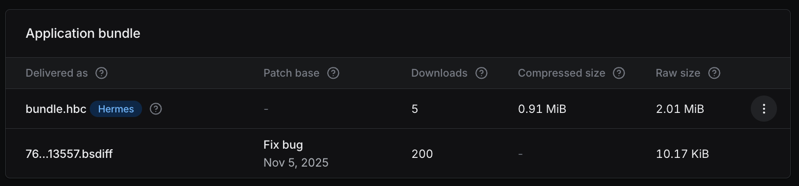 你可以通过使用 Updates.readLogEntriesAsync() 检查更新日志来确认是否正在提供 bundle diff。如果你的应用收到了补丁,你会看到一条表示补丁已成功应用的记录(例如,“patch successfully applied”)。
