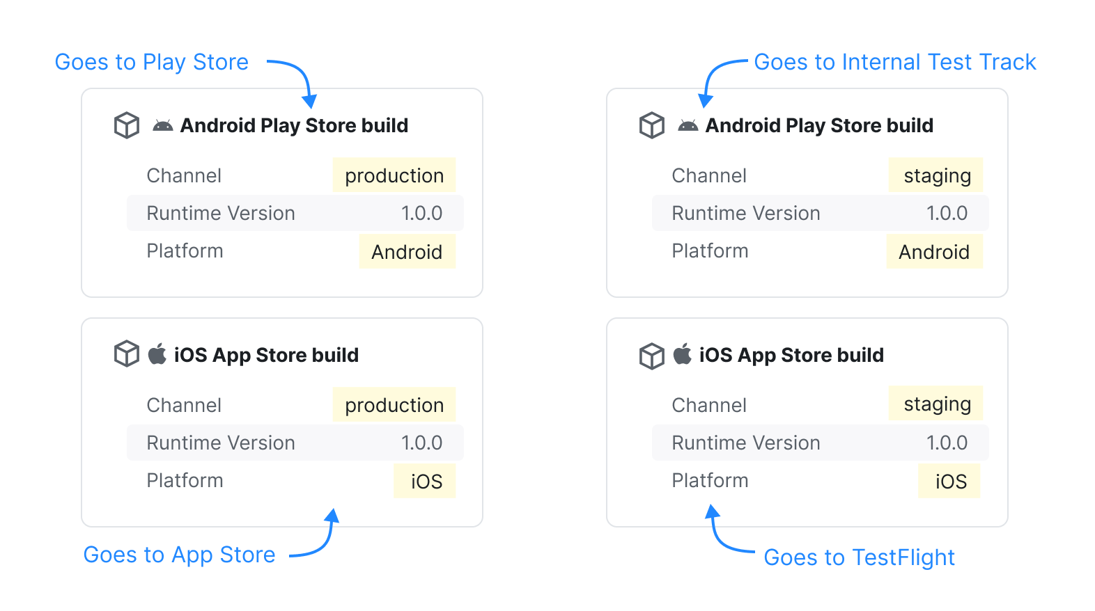 如果我们使用名为 "staging" 和 "production" 的渠道创建两组构建,那么我们可以把构建分发到四个不同的位置: