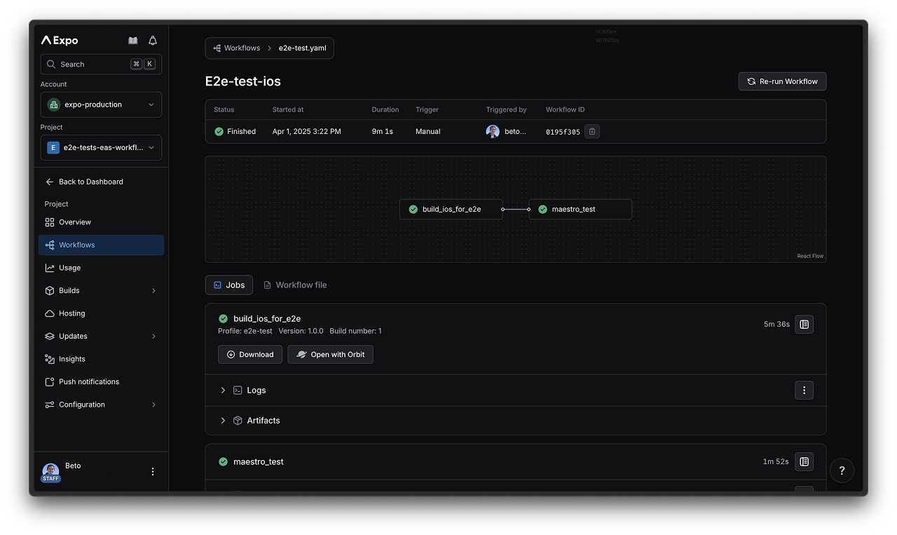 工作流启动后,你可以在 EAS 仪表板中跟踪进度并查看结果。下面是一个已完成工作流运行的截图: