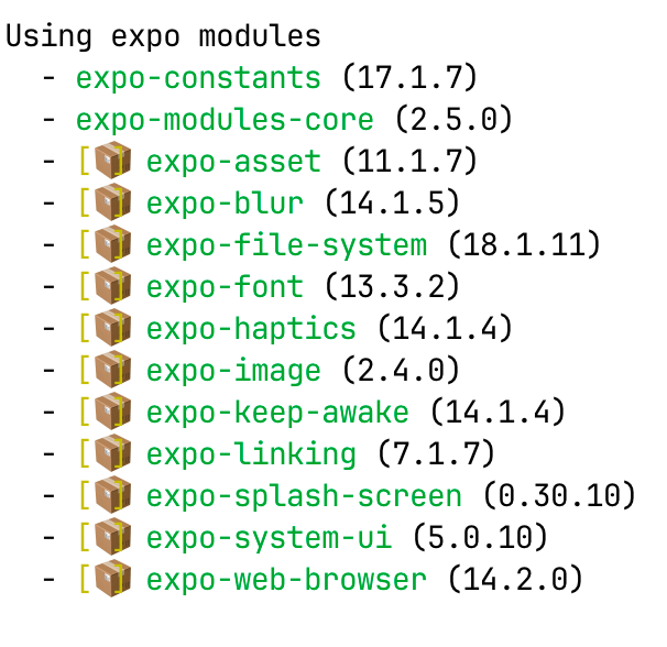 例如,在使用 SDK 53 的默认模板创建项目后,运行 npx expo run:android 命令时,你会注意到已预编译的包旁边带有 [📦 package-name 前缀: