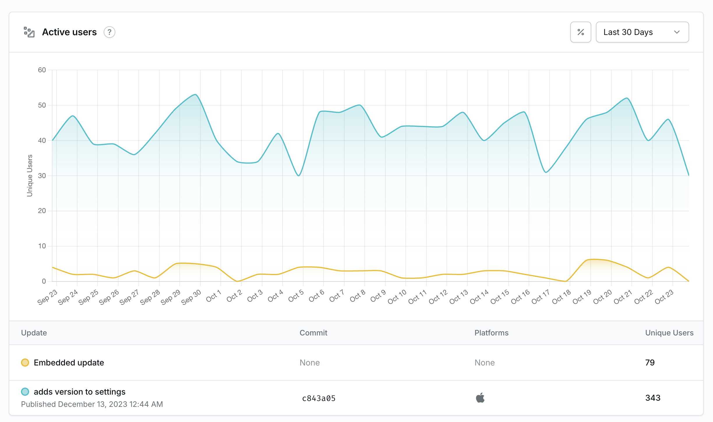Expo 提供了 expo-insights 库,用于跟踪与 EAS Update 相关的信息。这些数据包括应用版本、平台、操作系统版本以及更新采用情况。安装后并在应用商店发布生产版本,你就可以在项目仪表板上看到更多数据: