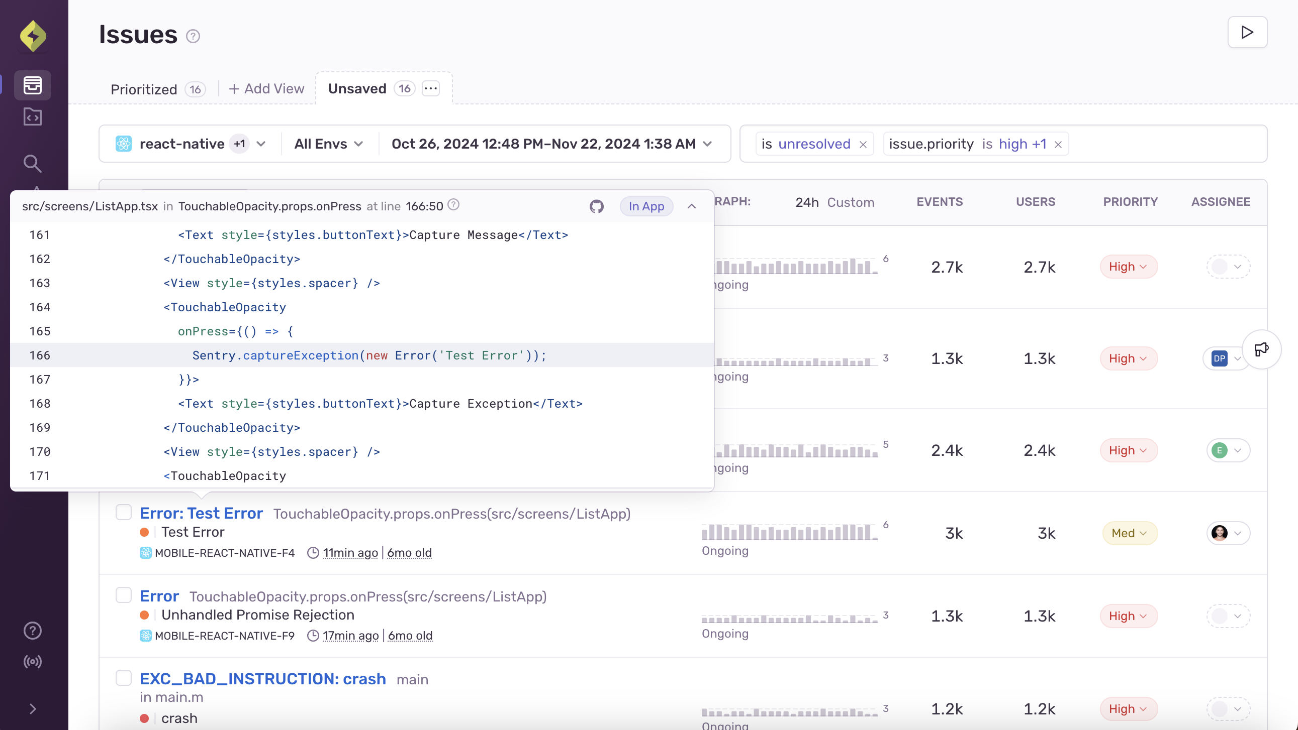 它会在你的用户使用应用时,将他们遇到的异常或错误通知你,并在网页仪表板中为你整理这些问题。报告的异常会自动包含堆栈跟踪、设备信息、版本以及其他相关上下文。你还可以提供与你的应用相关的额外上下文,例如当前路由和用户 ID。