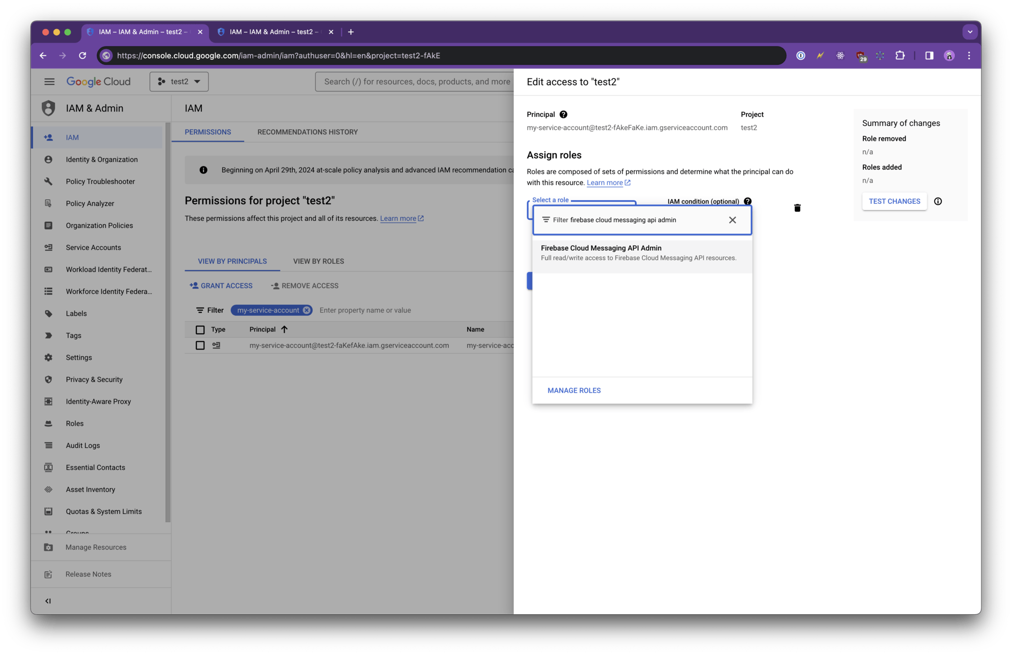 点击 Add Role,并从下拉菜单中选择 Firebase Messaging API Admin 角色。点击 Save。
