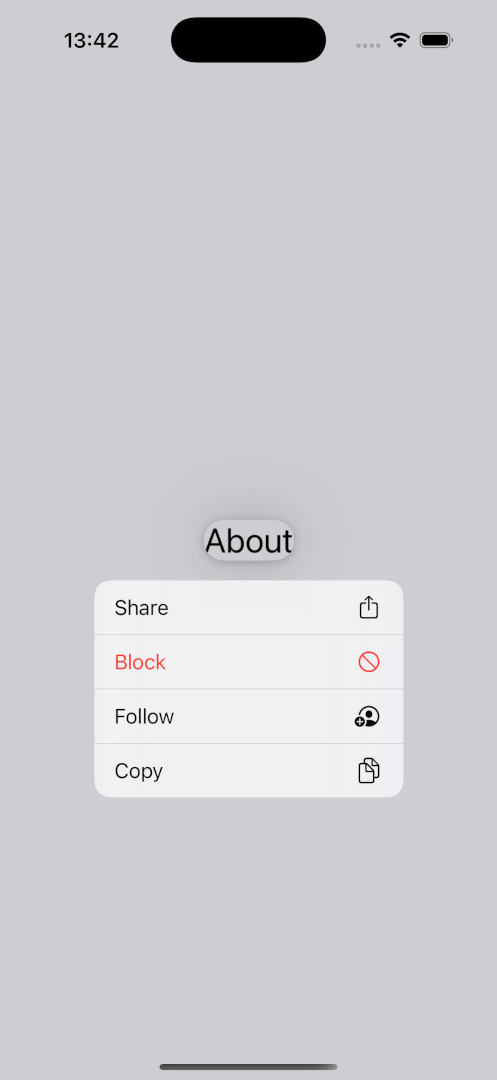 <Link href="/about"> <Link.Trigger>关于</Link.Trigger> <Link.Menu> <Link.MenuAction title="分享" icon="square.and.arrow.up" onPress={handleSharePress} /> <Link.MenuAction title="阻止" icon="nosign" onPress={handleBlockPress} /> <Link.MenuAction title="关注" icon="person.crop.circle.badge.plus" onPress={handleFollowPress} /> <Link.MenuAction title="复制" icon="doc.on.doc" onPress={handleCopyPress} /> </Link.Menu> </Link>