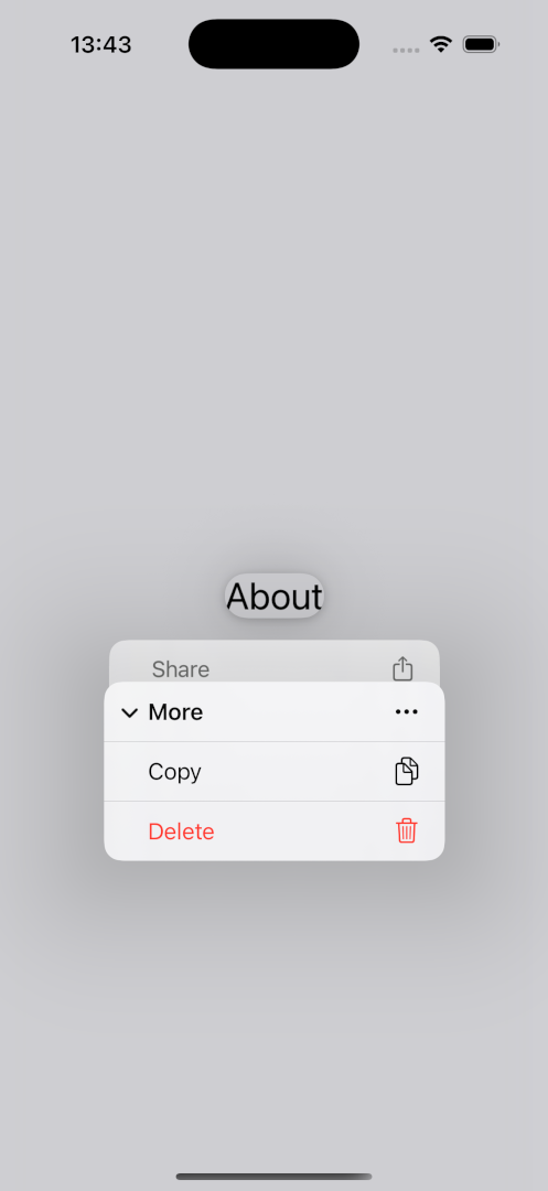 <Link href="..."> <Link.Trigger>关于</Link.Trigger> <Link.Menu> <Link.MenuAction title="分享" icon="square.and.arrow.up" onPress={() => {}} /> <Link.Menu title="更多" icon="ellipsis"> <Link.MenuAction title="复制" icon="doc.on.doc" onPress={() => {}} /> <Link.MenuAction title="删除" icon="trash" destructive onPress={() => {}} /> </Link.Menu> </Link.Menu> </Link>