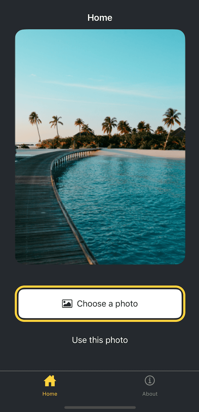 上面的屏幕显示了一张图片和两个按钮。应用用户可以使用这两个按钮中的任意一个来选择图片。第一个按钮允许用户从设备中选择图片。第二个按钮允许用户继续使用应用提供的默认图片。