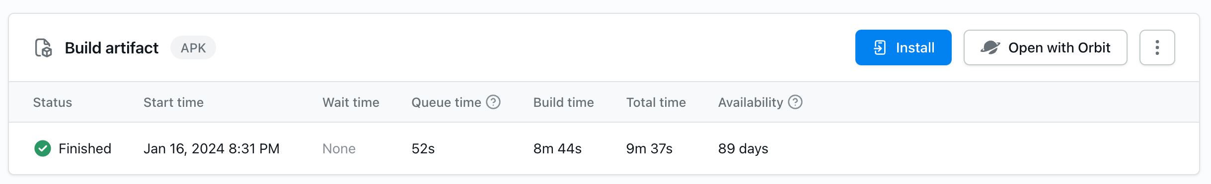 - 在 EAS 仪表板中,在 Build artifact 下点击 Open with Orbit。