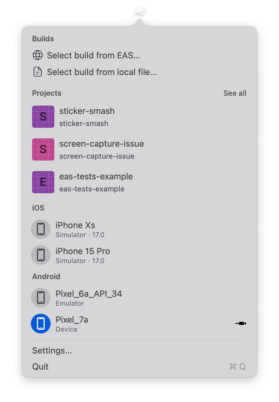 另外,也可以使用 Expo Orbit 进行安装。在 EAS 仪表板的 Build artifact 中,点击 Open with Expo Orbit,即可在 Android 模拟器上安装开发构建。