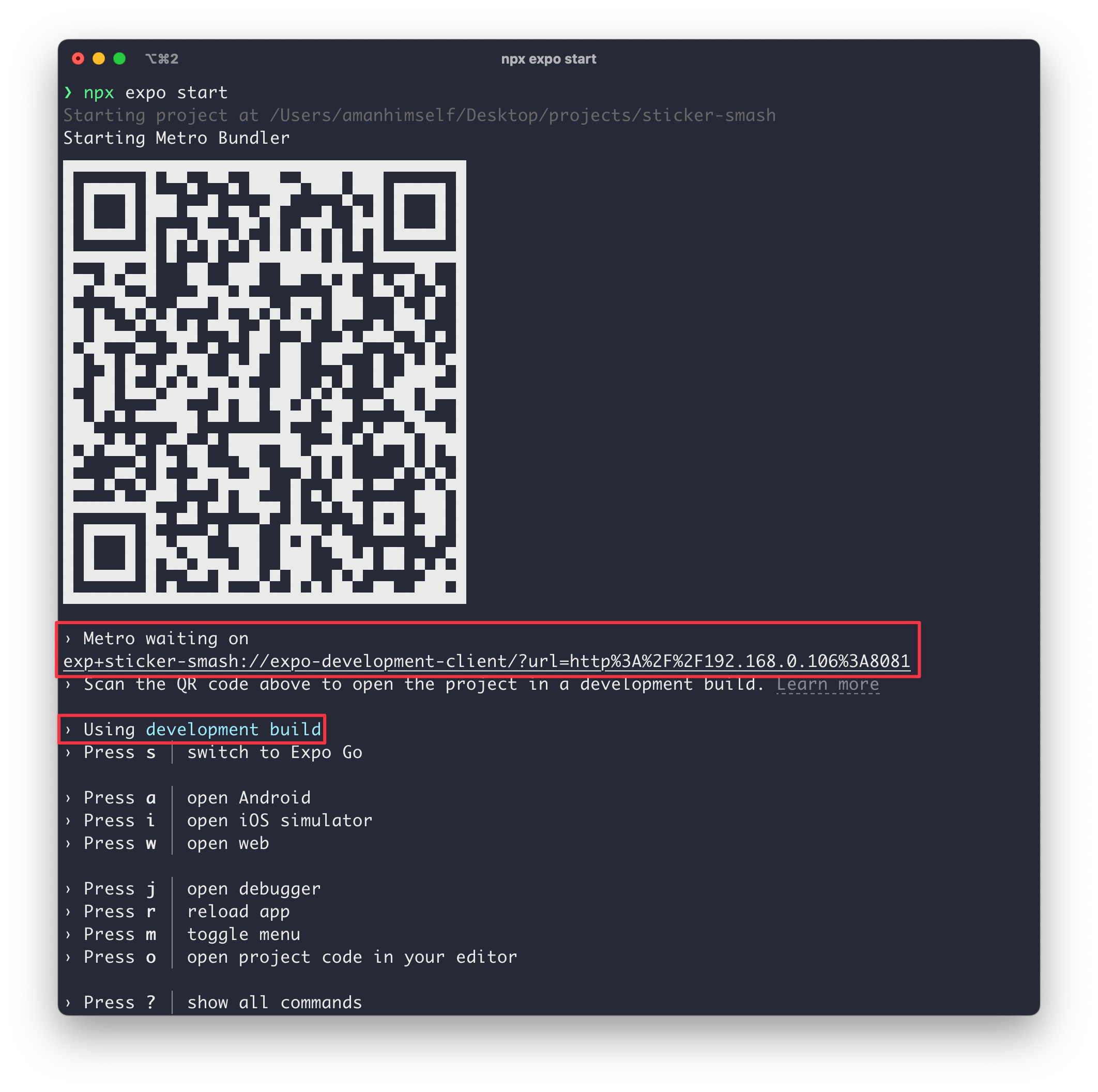 - npx expo start该命令会启动 metro bundler。在终端窗口中,我们会看到二维码,随后是 Metro waiting on... 和一个 manifest URL:
