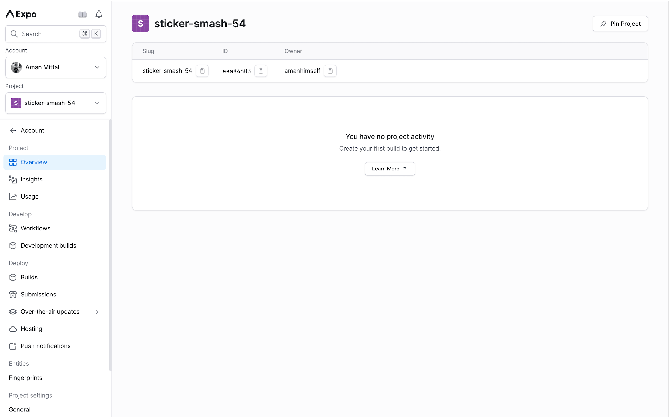 # 运行 eas init 后的输出✔ Which account should own this project? > your-username✔ Would you like to create a project for @your-username/sticker-smash? … yes✔ Created @your-username/sticker-smash✔ Project successfully linked (ID: XXXX-XX-XX-XXXX) (modified app.json)- 创建 EAS 项目,并提供该项目的链接,我们可以在 EAS 仪表板中打开它: