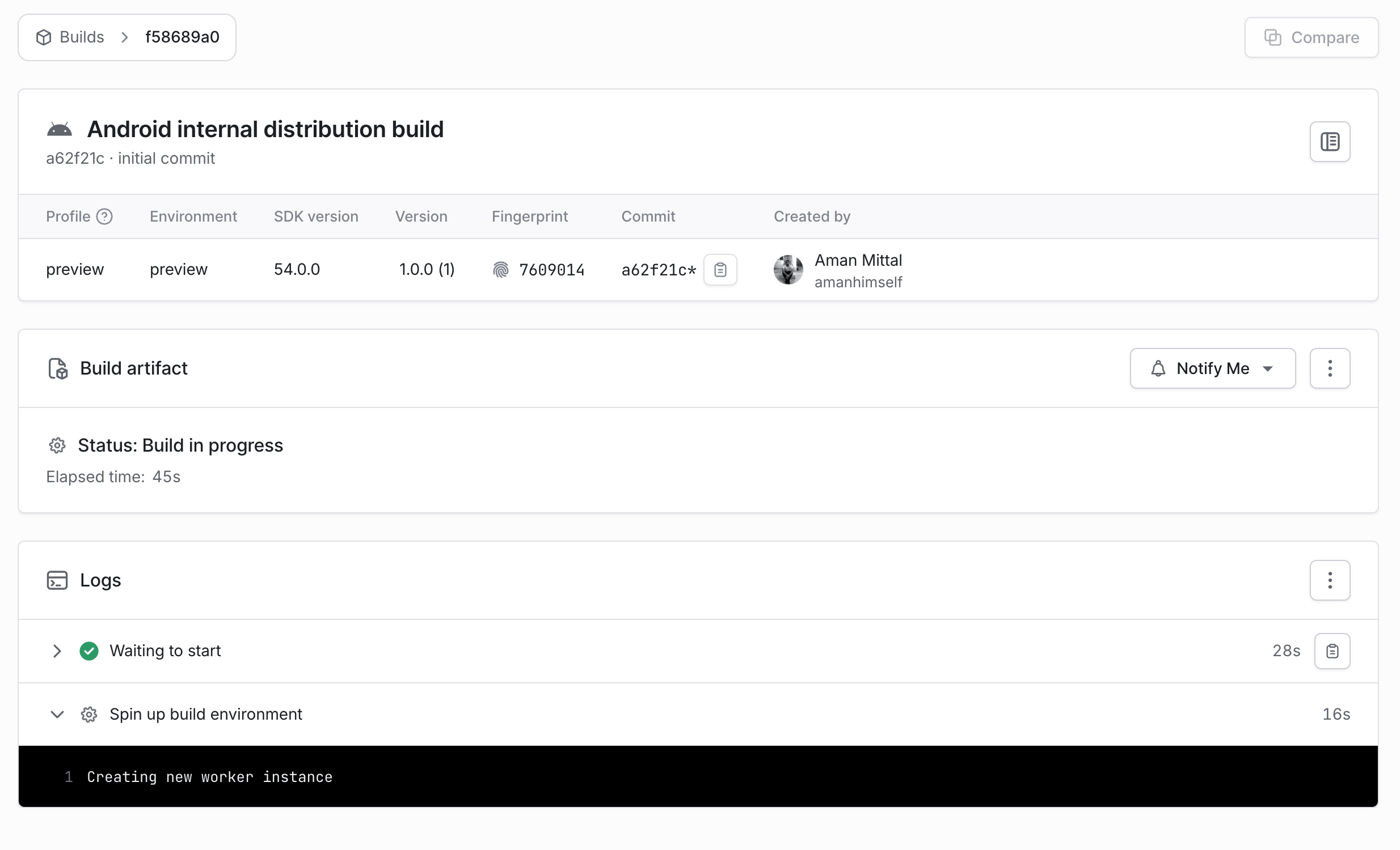 - eas build --platform android --profile preview- 此命令会触发 EAS Build,并且在 EAS 仪表盘中,我们可以看到构建进度: