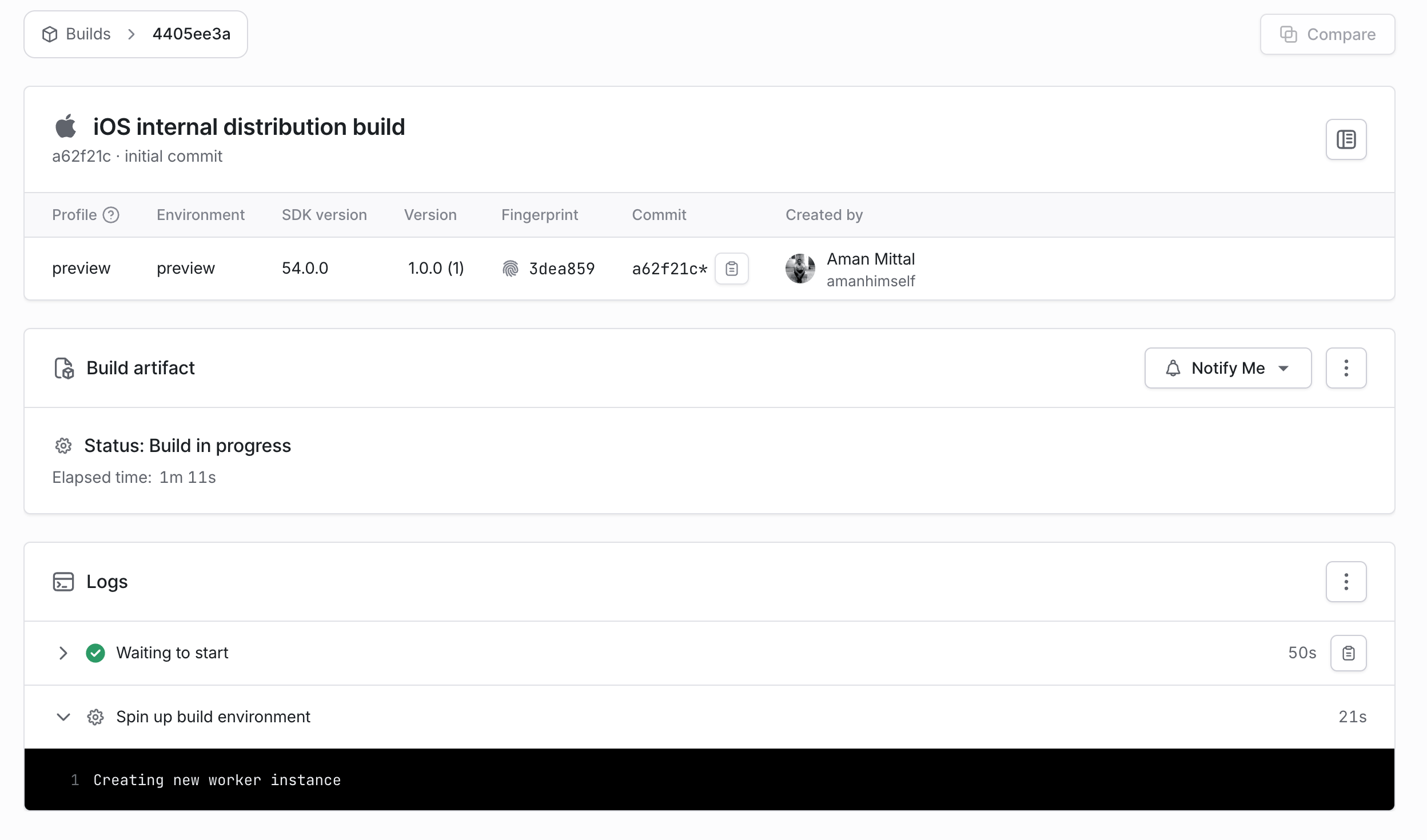 - eas build --platform ios --profile preview- 此命令会触发 EAS Build,并且在 EAS 仪表盘中,我们可以看到构建进度: