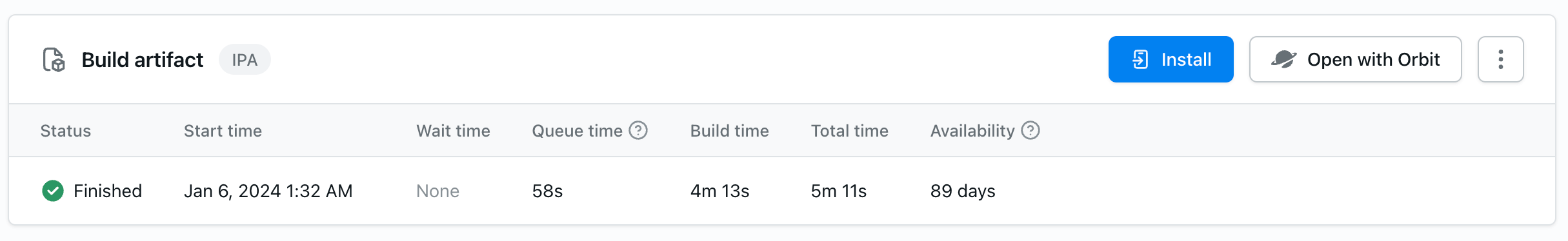 - 在 EAS 仪表盘中,位于 Build artifact 下,点击 Open with Orbit。
