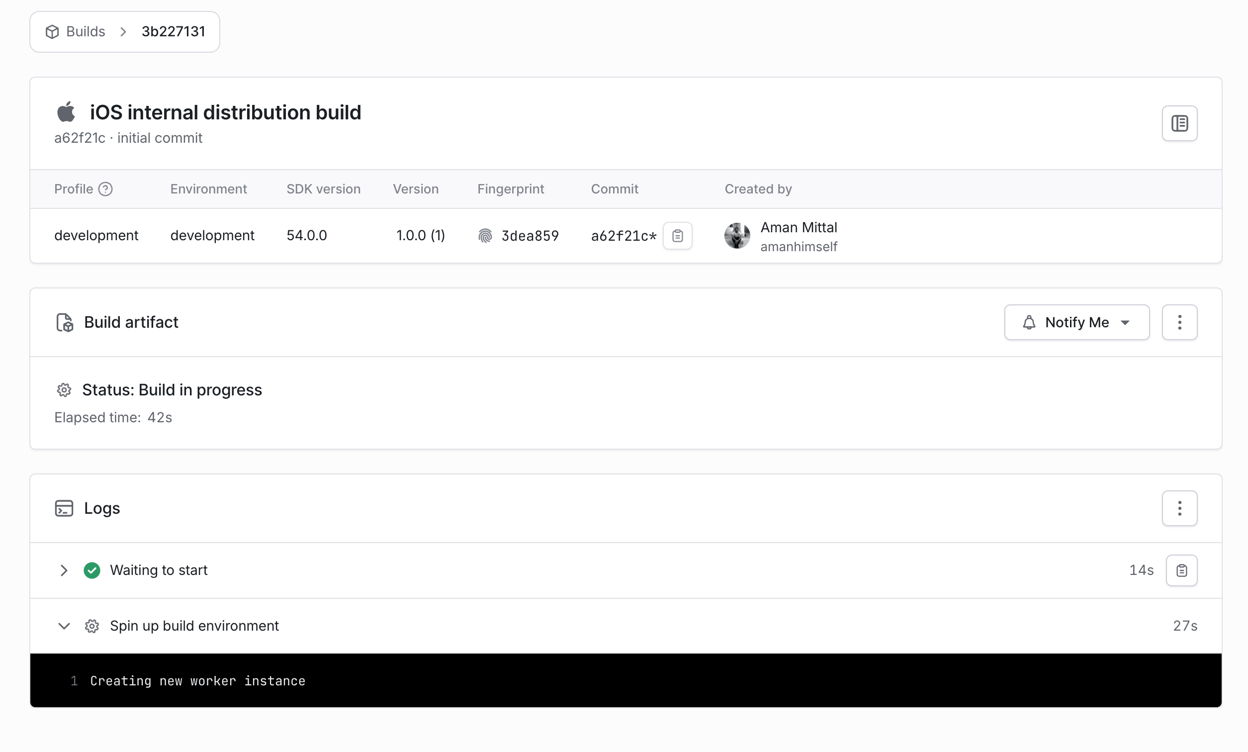 在上图中,Build artifact 的当前状态显示构建正在进行中。完成后,此部分将提供下载构建的选项。Logs 会概述 EAS Build 上 iOS 构建过程中执行的每一步。为了简洁起见,这里我们不会逐步展开每一步。要了解更多,请参阅 iOS 构建过程。
