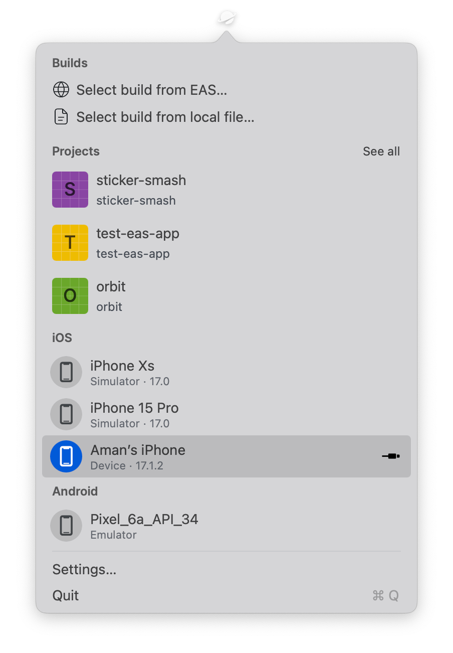 Expo Orbit 可以让你在 iOS 设备上无缝安装开发构建。使用此方法: