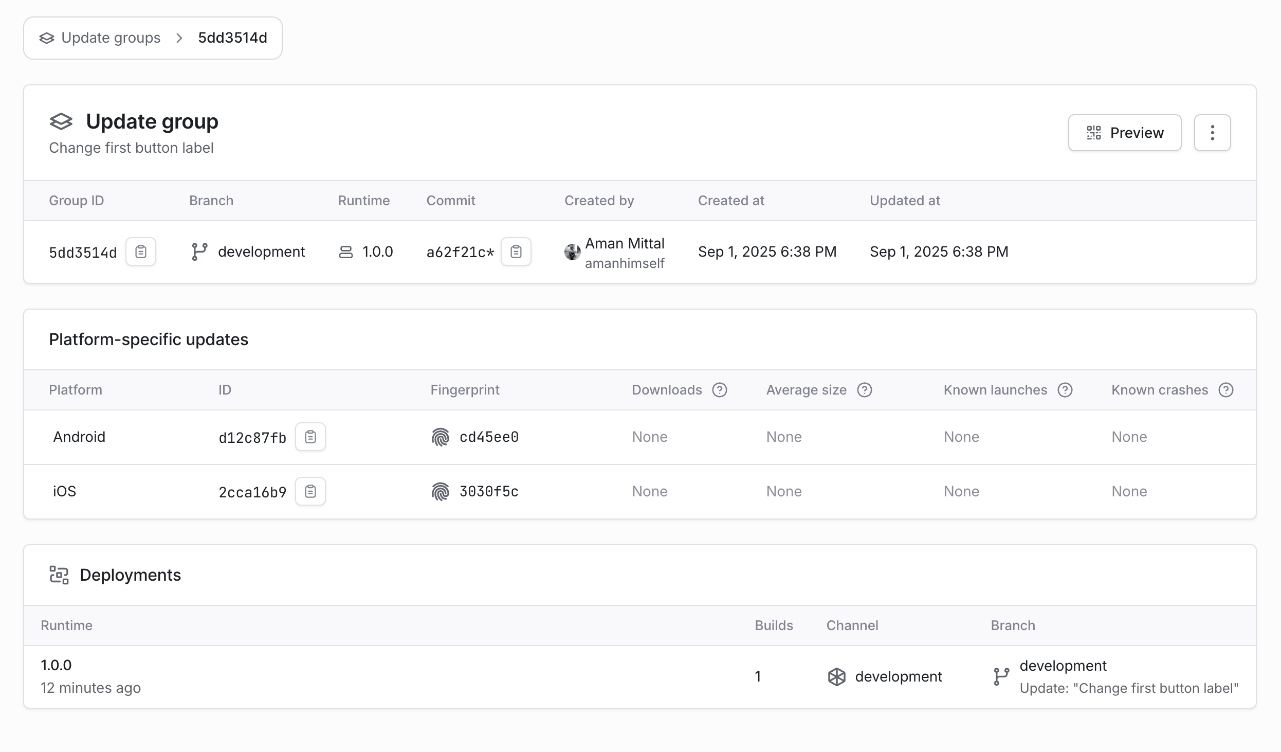 - eas update --channel development --message "Change first button label"在上面的命令中,我们使用了 development channel。每个更新都关联一个 channel name。这类似于我们在 git 中提交的每个 commit,都关联着一个 git 分支。