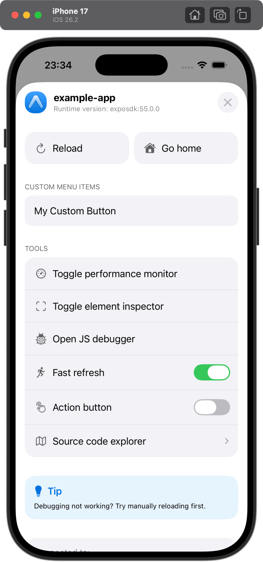 可以通过使用 registerDevMenuItems API 来扩展 dev menu,以包含额外按钮: